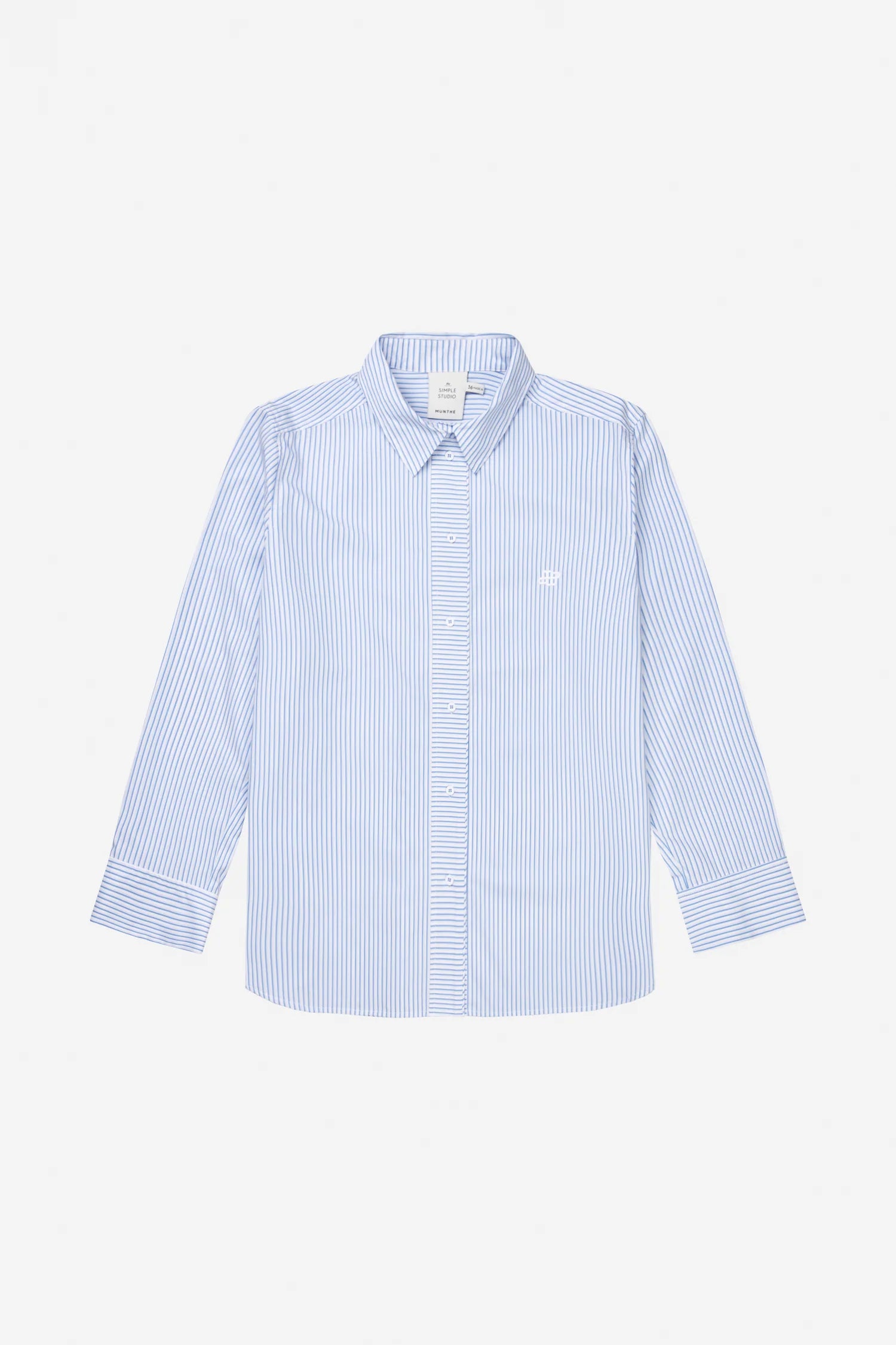 A shirt with beautiful pinstripes that are elegantly twisted to run horizontally along the button closure. This shirt features long sleeves with stylish cuffs and is designed for a loose fit.