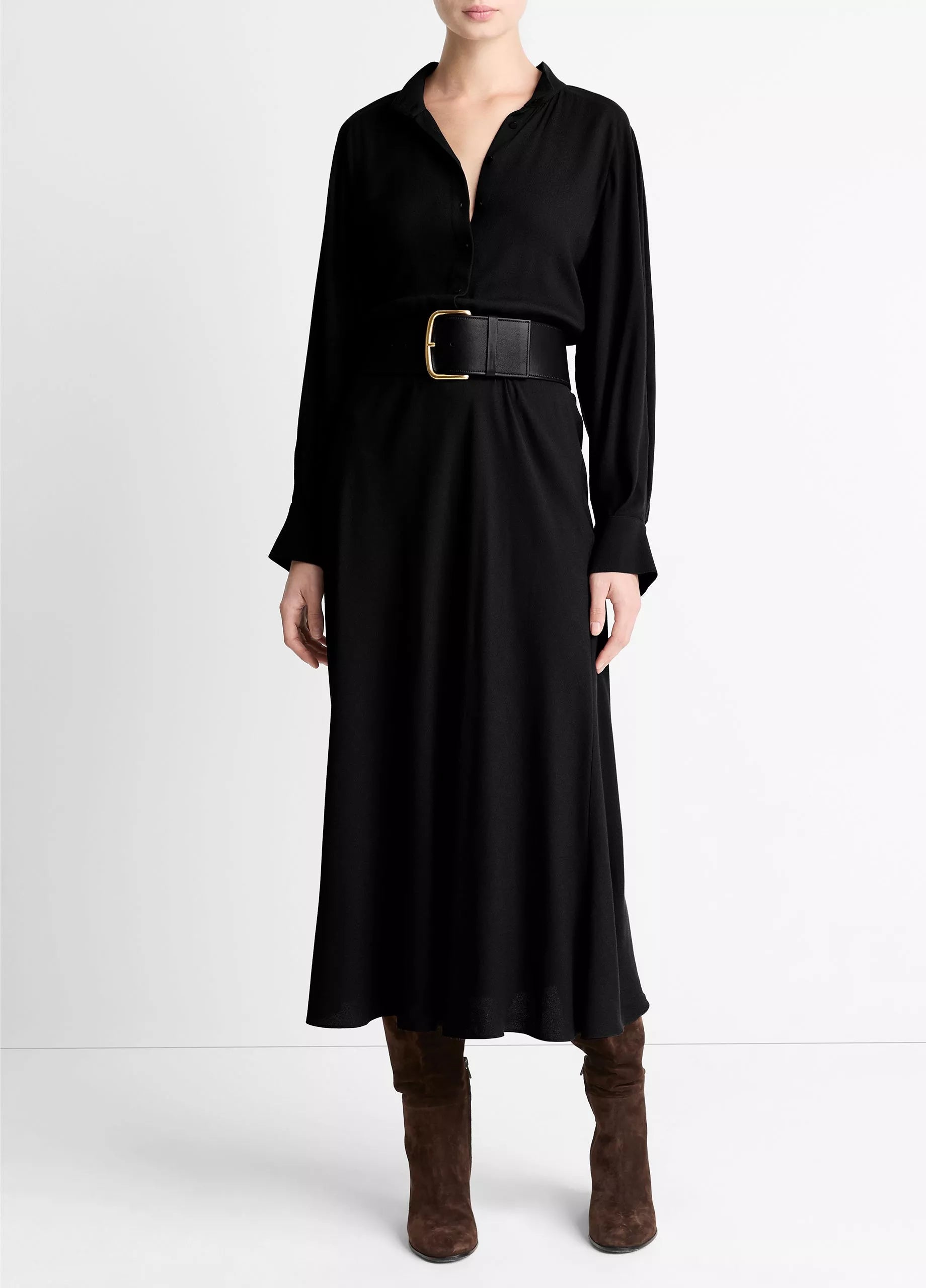 Our latest iteration on the timeless shirt dress is crafted from refined crepe and cut on the bias at the skirt for a fluid drape. Pleating at the dolman sleeves lends soft volume, balanced by a self-tie belt to cinch the waist as desired.