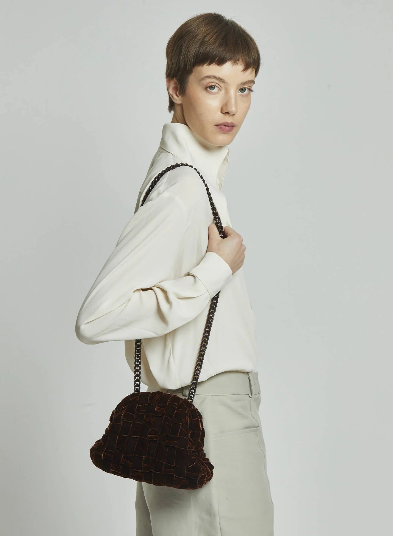 Small women's clutch in woven velvet ribbon fabric, handmade on ancient looms. This model is the Maria La Rosa icon bag, perfect for the winter season, emblem of a new metropolitan elegance, which ensures capacity and functionality. It is equipped with a tone-on-tone chain to wear it also as a shoulder bag and there are many color varieties to choose from. Entirely designed and produced in Italy.